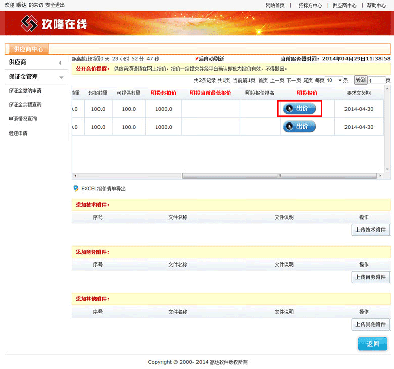2進(jìn)入“供應(yīng)商中心—標(biāo)書(shū)查詢—我要報(bào)價(jià)”確認(rèn)協(xié)議后點(diǎn)擊對(duì)應(yīng)物料的出價(jià)按鈕,