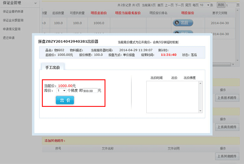 3在彈出的出價(jià)器中,選擇降價(jià)梯度(例:若招標(biāo)方設(shè)置梯度為100元,當(dāng)前價(jià)為1000元,則降低1個(gè)梯度后出價(jià)為900元),點(diǎn)擊出價(jià)。