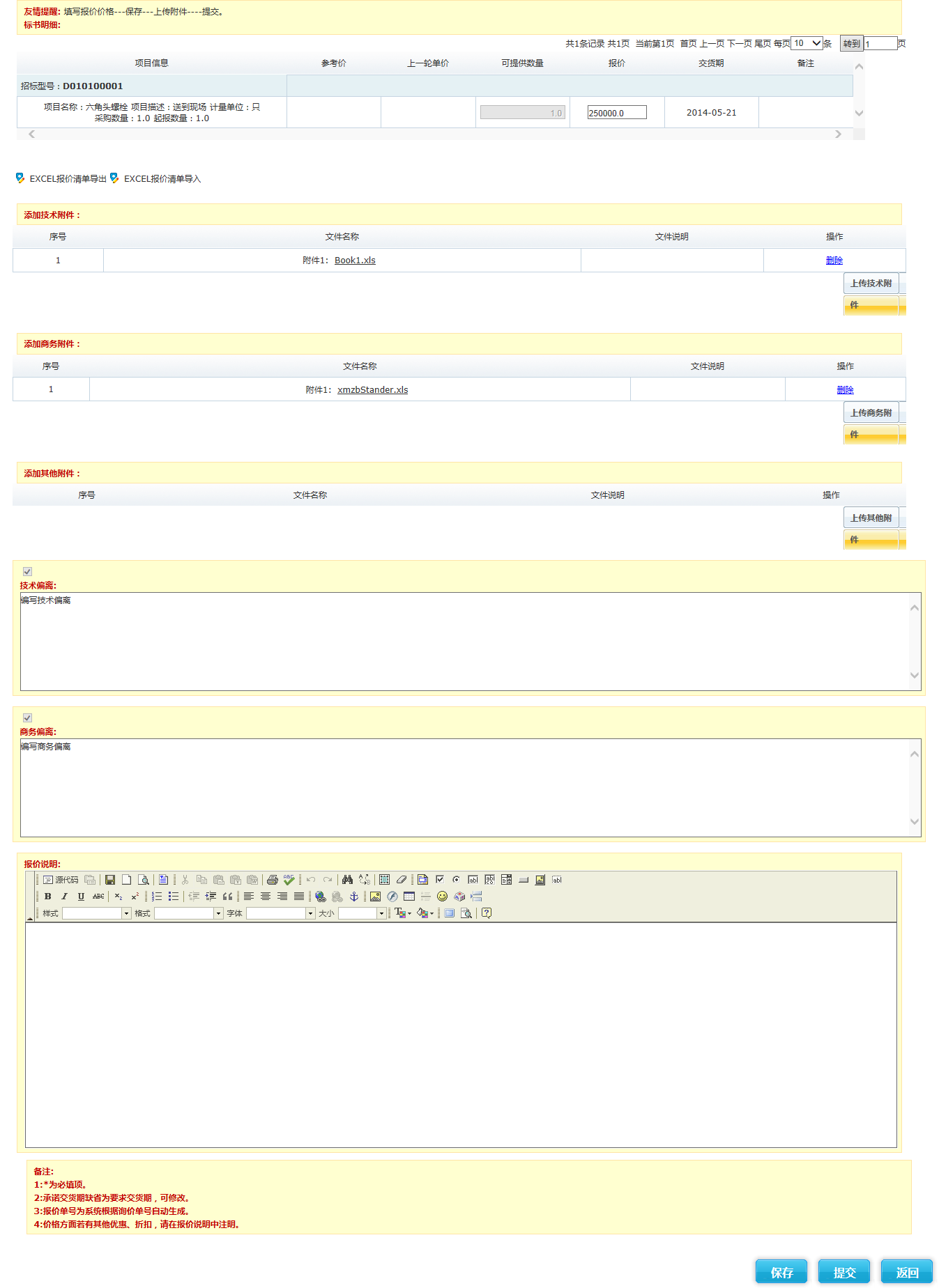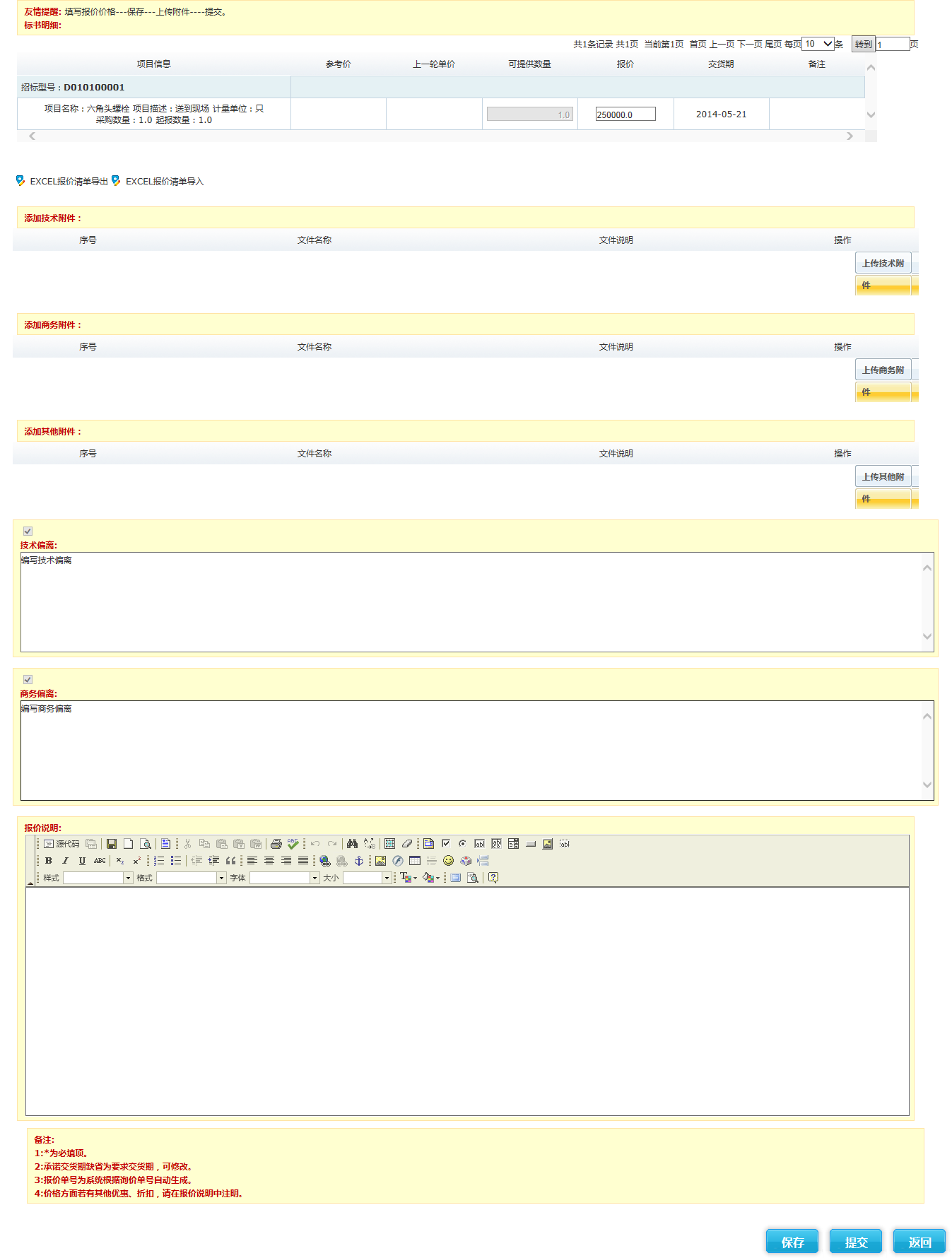 3、填寫報價,填寫技術偏離以及商務偏離,填寫完之后請務必先保存
