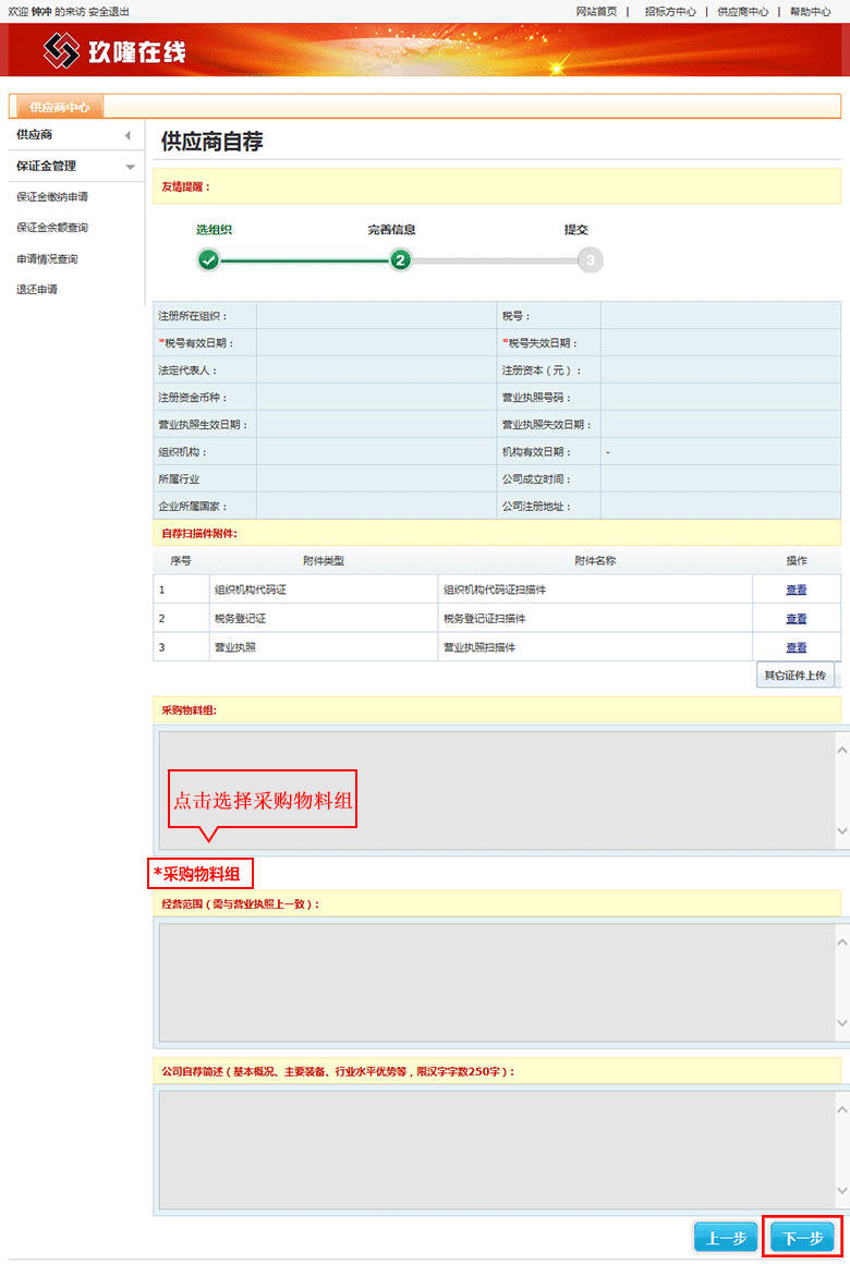 1進(jìn)入“供應(yīng)商中心—供應(yīng)商自薦”,選擇采購組織,點(diǎn)擊下一步