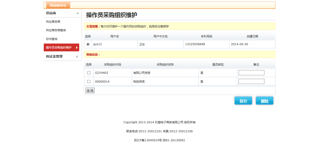 供應商完成自薦之后,進入操作員采購組織維護界面,選擇需要維護的資質
